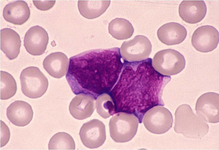 光顕的所見 白血球増加(13,800/μl)にて、末梢血に芽球が52%みられた。N/C比は高く、核形不整や核小体を認める。細胞質の好塩基性も強い。