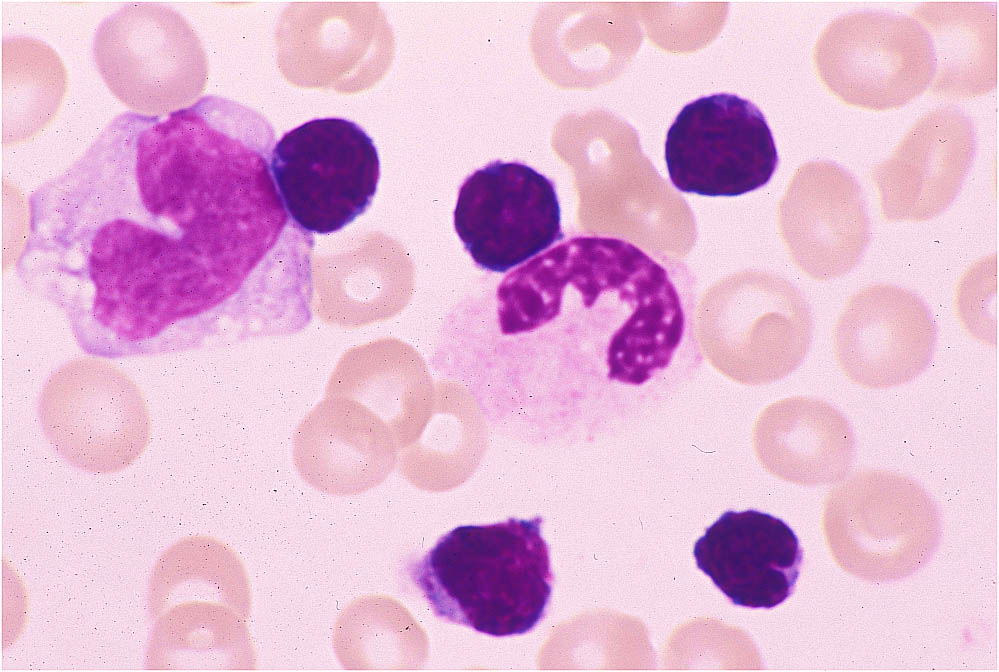 光顕的所見 増加するリンパ球全般に小型で、N/C比は高く、クロマチンは増量し、核形不整が顕著でアズール顆粒は一部に認めた。
