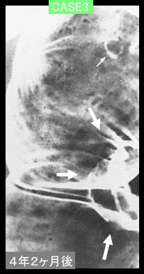 ![]() 背景色の変更 [ 画像ID:11841 ]case3は1988年に切除された症例です。患者さんの問題を含めて種々の理由で、また複数の施設にて3回以上の注腸X線検査がなされましたものを、集めて検討いたしました。いずれも医学上で、進行大腸癌への発育進展の解明に大いに寄与した例でしたので、提示いたします。 ■詳細データ