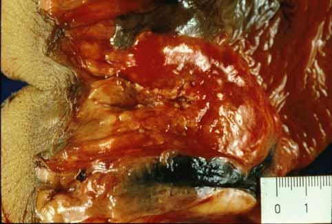 ![]() 背景色の変更 [ 画像ID:1629 ]直腸下部の扁平上皮癌の切除標本 肛門から直腸の切除標本で、新鮮肉眼所見を示しています。約8cm×5cm大の大きな腫瘍が、粘膜下腫瘍様の所見を呈しています。なお、黒色の部分は、術前にリンパ節を染めるために注入された色素です。 ■詳細データ