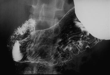 ![]() 背景色の変更 [ 画像ID:1911 ]IIc型早期胃癌のX線像 背臥位による胃二重造影写真です。胃角部の小弯から後壁にかけて、粘膜の不整が認められます。 ■詳細データ
