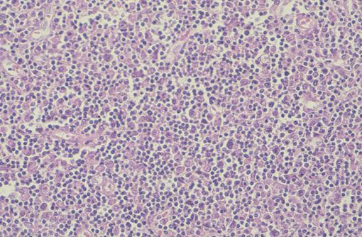 ![]() 背景色の変更 [ 画像ID:2154 ]胃体部の広い範囲に認められたいわゆる早期胃悪性リンパ腫の病理組織像(ミクロ) 病理組織の中拡大像です。異型性を示す中~大型のリンパ球様の腫瘍細胞がびまん性に増生しています。 ■詳細データ
