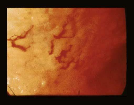 ![]() 背景色の変更 [ 画像ID:2256 ]小結節状隆起の集簇を示した表在型の早期胃悪性リンパ腫の内視鏡像 胃体部の前壁をみた胃の内視鏡写真です。(id:2255)より少し口側で、胃体下部の前壁の近接写真です。精査時に空気を入れただけで、病的な自然出血が散在してみられ、丸味を帯びた粗大な顆粒の間に、網状にたまっています。 ■詳細データ