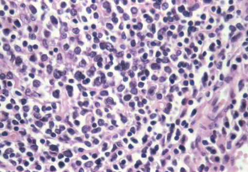 ![]() 背景色の変更 [ 画像ID:2275 ]小結節状隆起の集簇を示した表在型の早期胃悪性リンパ腫の病理組織像(ミクロ) 強拡大の病理組織像です。中型から大型の異型リンパ球の増殖がみられます。悪性リンパ腫の病理像を示しています。 ■詳細データ