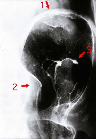 ![]() 背景色の変更 [ 画像ID:2280 ]多発腫瘍を主体とした進行胃悪性リンパ腫のX線像 立位による胃の二重造影写真で、(id:2279)のBの写真を拡大したものです。胃の穹窿部の前壁にある病変(矢印1)、胃体上部小弯にある病変(矢印2)および胃体上部後壁にある病変(矢印3)が、それぞれ認められます。これら3個の腫瘤の間には、正常の粘膜が介在しています。 ■詳細データ