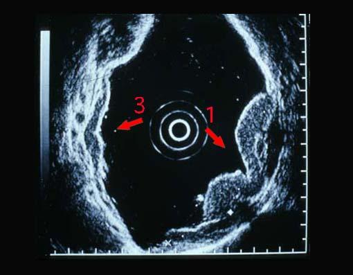 ![]() 背景色の変更 [ 画像ID:2290 ]多発腫瘍を主体とした進行胃悪性リンパ腫のエコー像 ミニチアプローベ(miniature probe)を用いて、水浸法で検査された超音波内視鏡像です。層構造を保ちつつ、2~4層が肥厚しており、低エコー(hypoechoic)を示す隆起(矢印1と3の病変に相当)を形成しています。 ■詳細データ