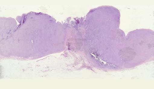 ![]() 背景色の変更 [ 画像ID:2301 ]多発腫瘍を主体とした進行胃悪性リンパ腫の病理組織像(ミクロ) (id:2299)と(id:2300)で示した矢印1の病変の割面ルーペ像です。粘膜下層(sm)を主体にびまん性の腫瘍細胞浸潤があり、一部では固有筋層(mp)におよんでいます。またこの腫瘍の表面には、びらん形成が認められます。 ■詳細データ