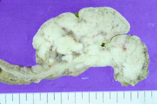![]() 背景色の変更 [ 画像ID:2378 ]下血を主訴とした肺癌からの転移性小腸腫瘍(72才,男性)の切除標本(マクロ) 切除標本の割面像です。病変は、内腔側と漿膜側にまたがる3.5cm大の病変です。腫瘍は充実性で、均一な白色調を呈しています。 ■詳細データ