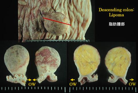 장중적과 주변부에 수반성의 궤양을 동반한 결장의 지방종
